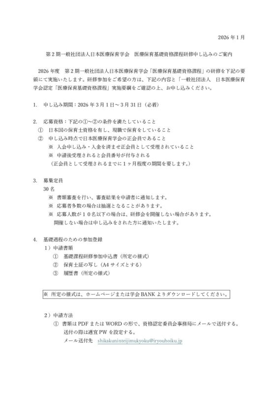 第2期医療保育基礎資格課程研修申し込みのご案内